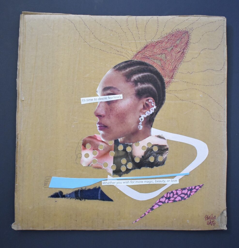 Title: Desire Fearlessly Medium: Magazine, cloth, ink pen on cardboard Dimension: 9″x 9″