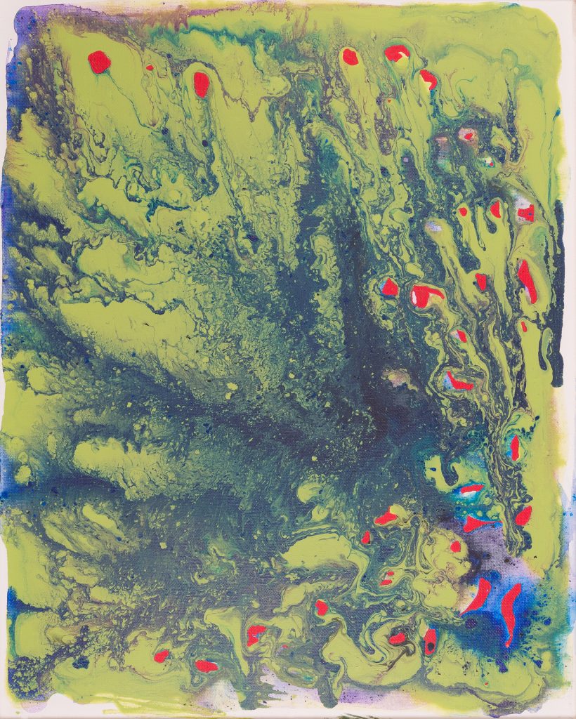 Title: The Green Eruption Medium: Tempera paint with sharpie Dimension: 16” x 20”